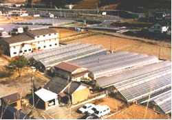 二人の写っている写真の部分に注目して下さい。ハウスの向きが少しおかしくないですか?実は、南北に建てたハウスに斜めに畝を立てているのです。これにより、写真の右と左の果実に午前と午後均等に光線が当たります。1997年より、これを導入して以来飛躍的に秀品率がアップしました。